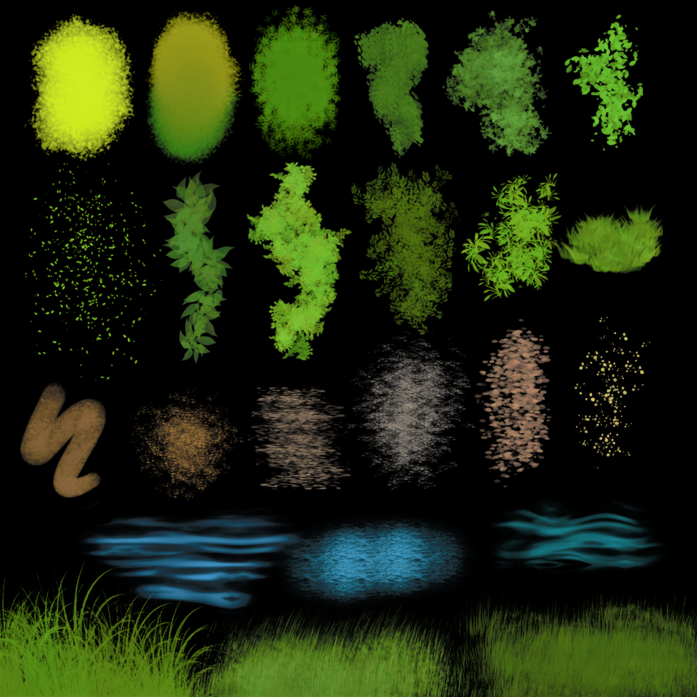 You'll get 3 Smudge Brushes, 8 Leaf/Bush Brushes, 4 Grass Brushes, 5 Dirt/Stone Brushes, and 3 Water Brushes.