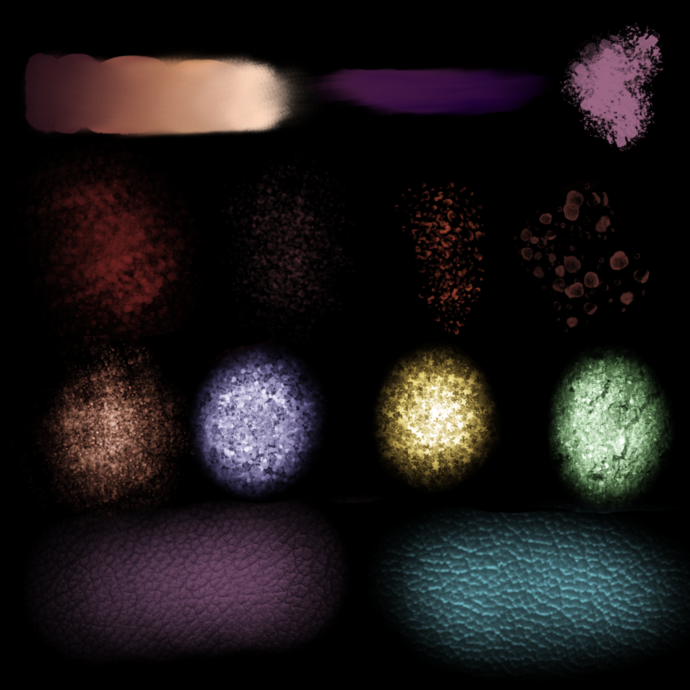 You'll get 2 Smudge Brushes, 2 Patch/ Bruised Skin Brushes, 3 Freckle Brushes, 4 Glow/Glitter brushes, & 2 Rough Skin Brushes.